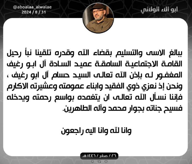 الامين العام لكتائب سيد الشهداء الحاج ابو الاء الولائي يعزي عائلة وذوي الفقيد السيد حسام آل ابو رغيف عميد السادة
