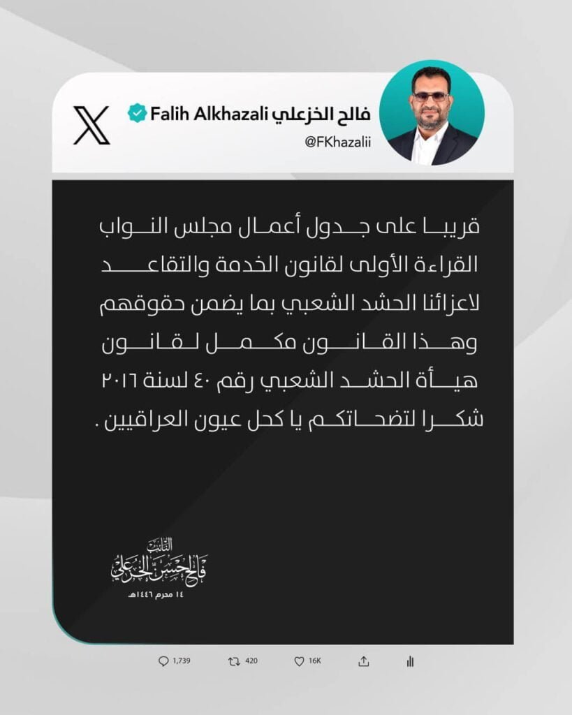 رئيس كتلة منتصرون البرلمانية فالح حسن الخزعلي: قانون الخدمة و التقاعد للحشد الشعبي قريبا على جدول أعمال البرلمان